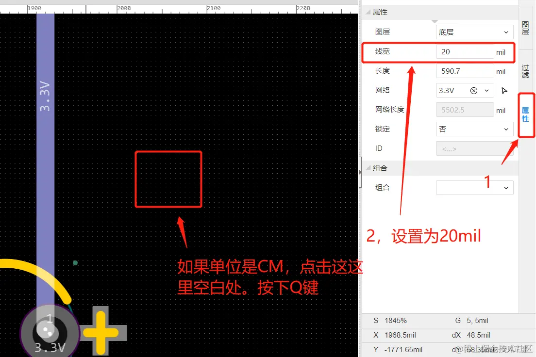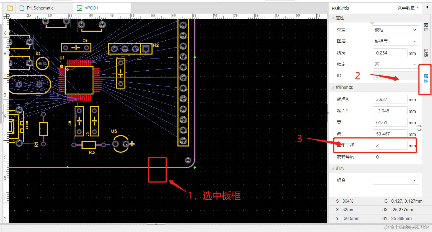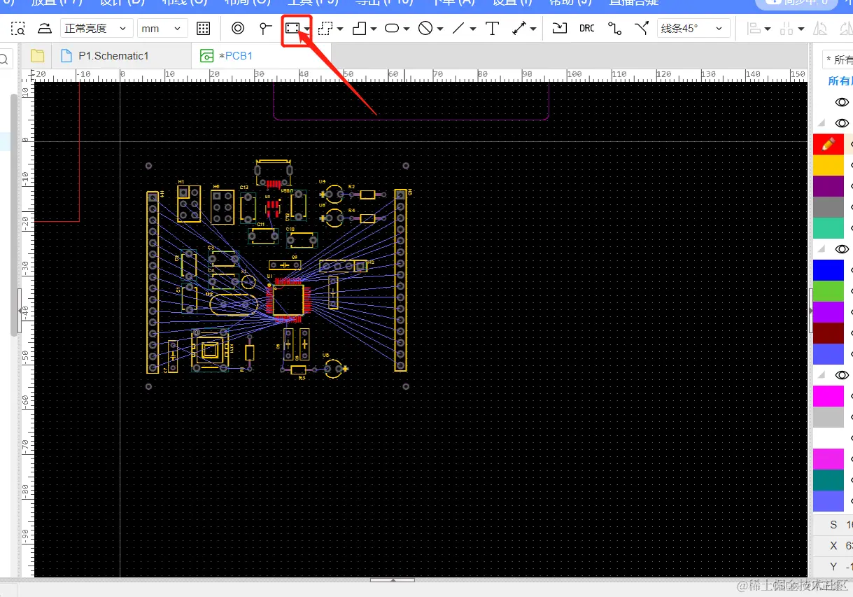 布局之后需要设置板框,选中板框,按照布局设置一个合理的板框大小。建议在10*10cm之内,因为这样就可以白嫖嘉立创的板子。