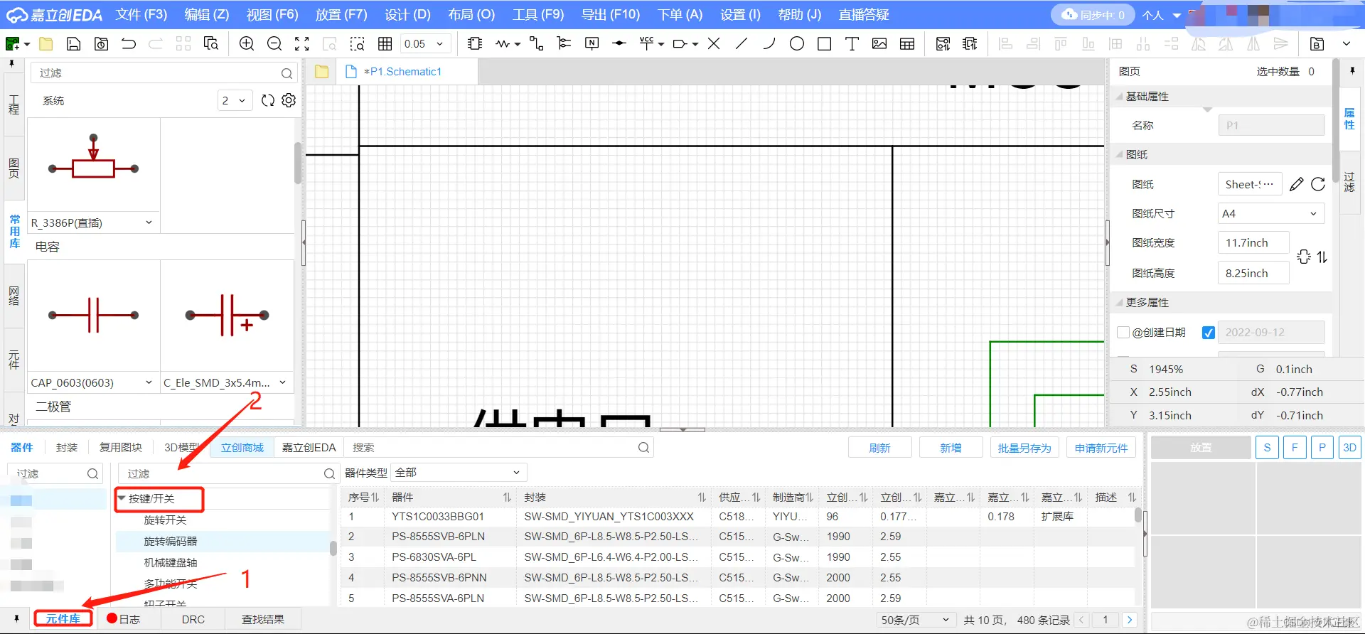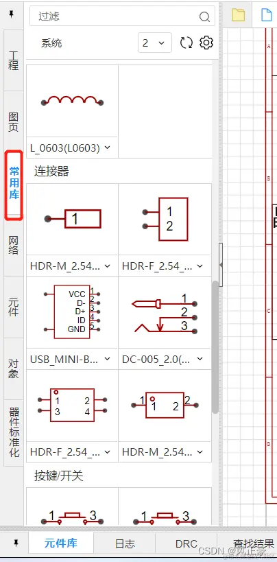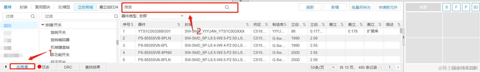 立创EDA有两个地方可以寻找对应的器件,一个是常用器件库,一个是元件库。