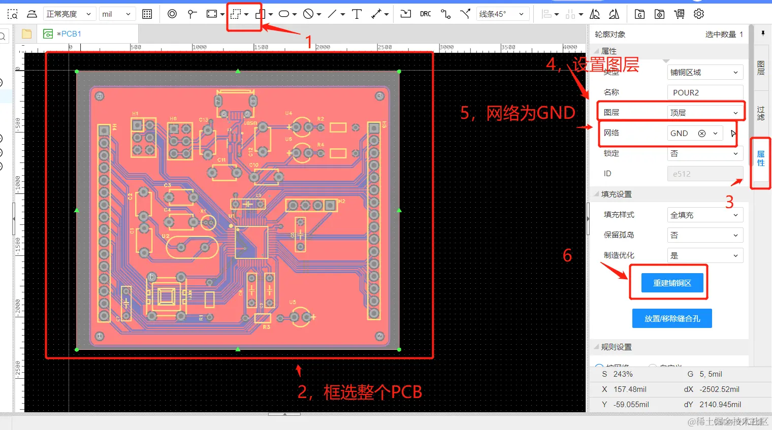 注意,顶层和底层都需要铺铜! 所以需要重复如下操作一次(也就是说,顶层和底层都需要铺铜)
