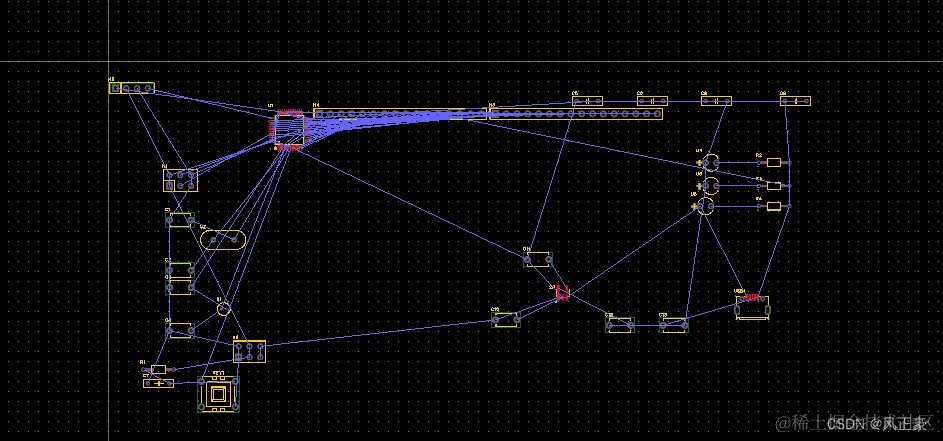 (1)刚接触PCB设计的人不知道这些蓝色的线是什么东西。我介绍一下,这个叫做飞线。上面说原理图的时候我说了,按W来连接不同器件,这个线是有电气属性的,简单来说就是可以导电,之后会导入到PCB中。而这个被导入的就是这个蓝色的线。