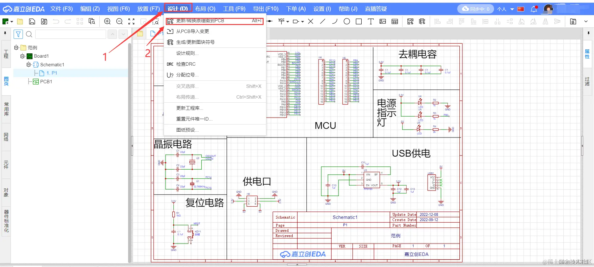 完成了原理图设计之后,点击更新/转换原理图到PCB。(注意,这里你必须打开的是原理图的界面! )