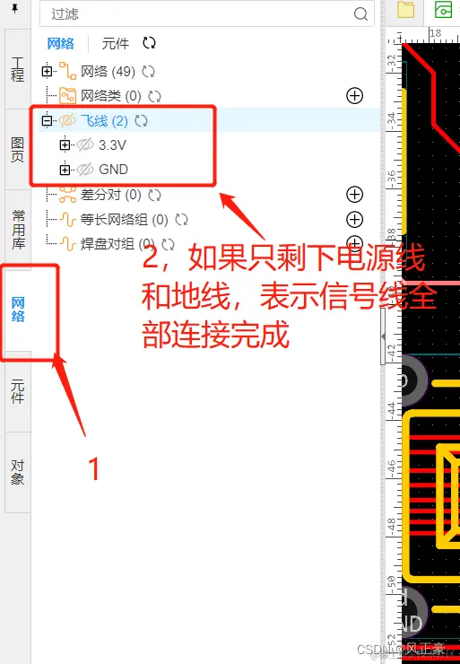 如果从飞线这里看没发现只剩下电源线和地线,表示信号线已经绘制完成。
