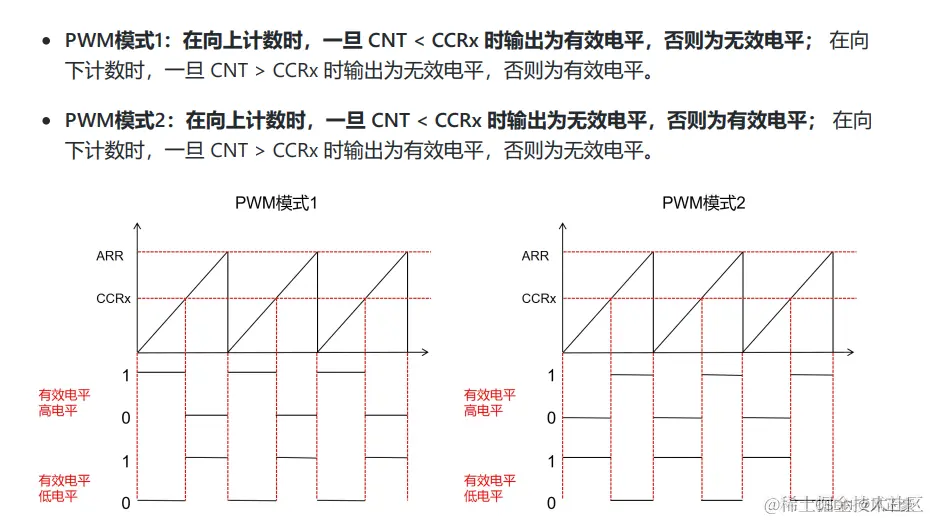 STM32的PWM比较强大,有两种PWM模式,根据极性不同,又可以变成四种输出方式。比较花哨。