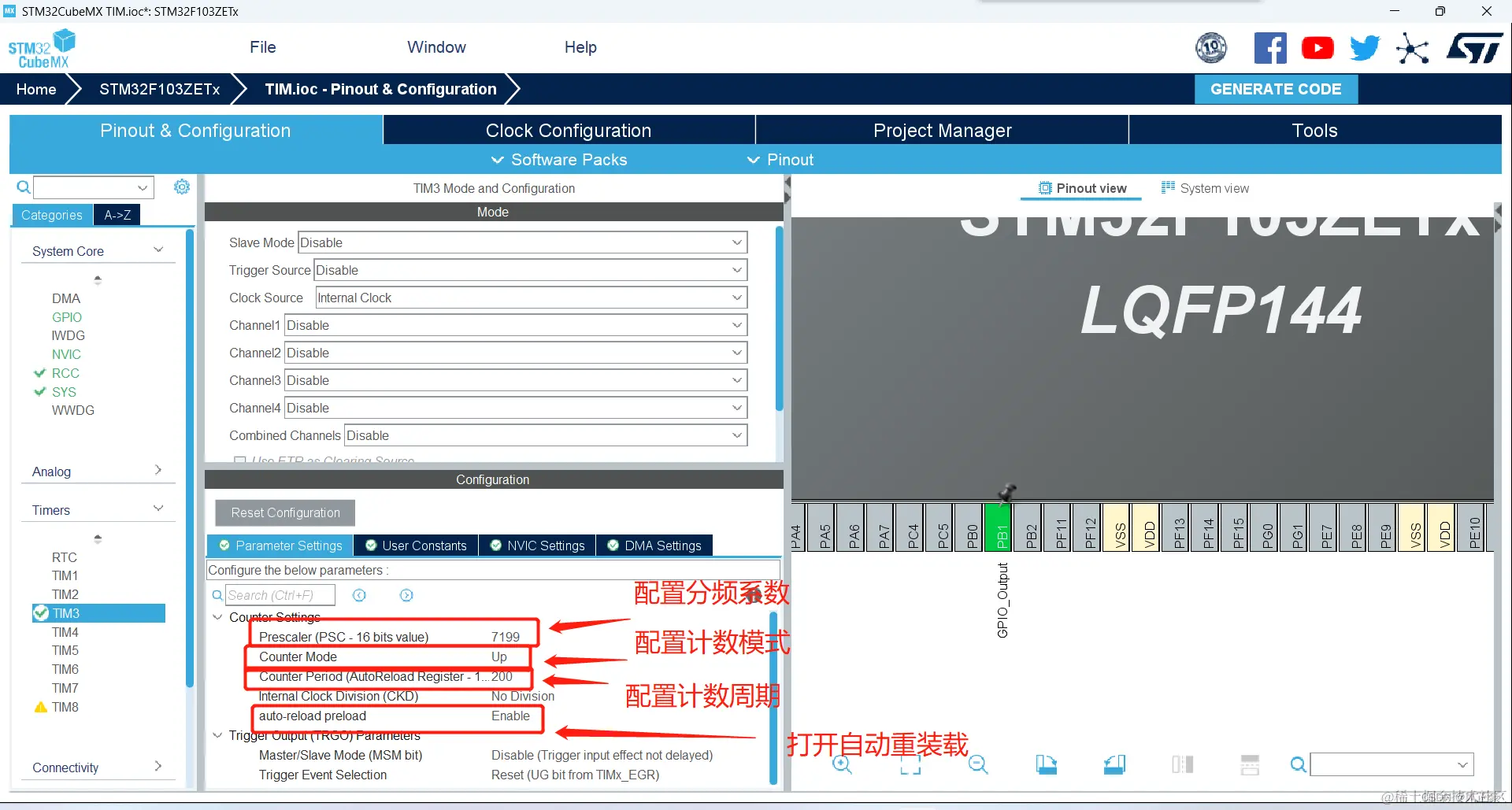 预分频系数:假设我们现在的APB1是72MHZ,由图三可知TIM2是由APB1提供时基,所以此时TIM2的频率是72MHZ,这也代表了TIM2的计数寄存器跳变72次才等于1us。这样的话,TIM2的最大定时事件就只有6.5536ms(16位定时器)。这个定时事件太短了,而且高频代表着耗电(一般不考虑),所以我们需要一个预分频器进行分频。比如分频7199(注意,因为是从0开始,所以想要分频7200,就输入7199),那么现在定时器的实际频率就是10kHZ,表示TIM2计数寄存器增加1,代表着100us。