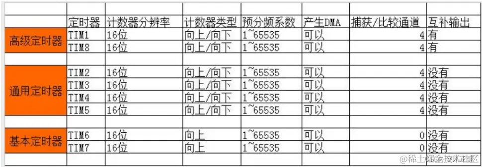 | 基本定时器 | 没有输入捕获通道,常用于时基,即定时功能。(也就是只能用于定时器中断,无法硬件PWM,与C51的定时器一样作用) |