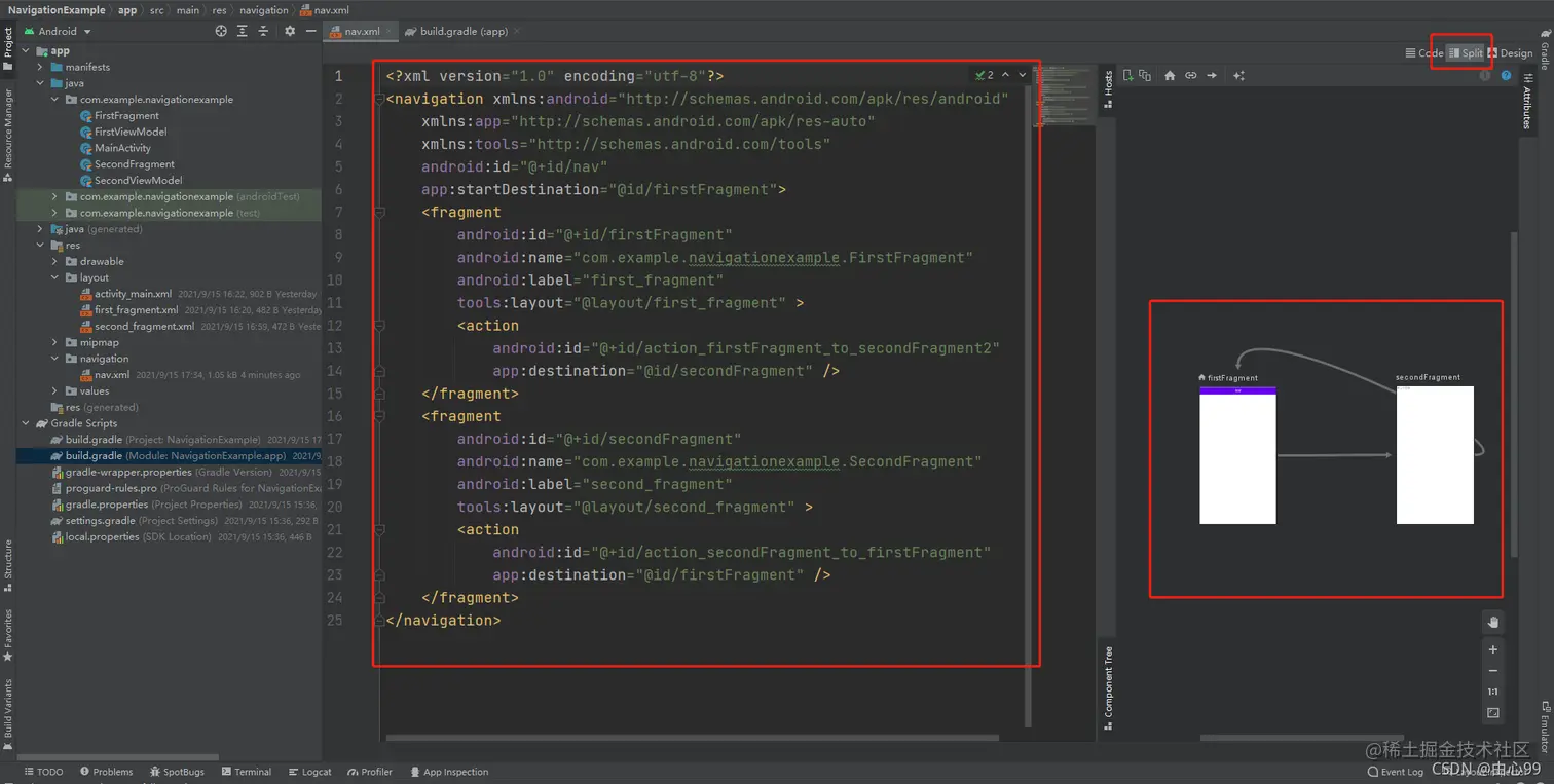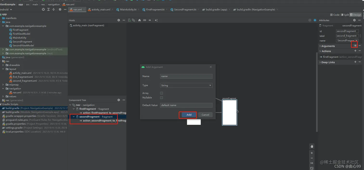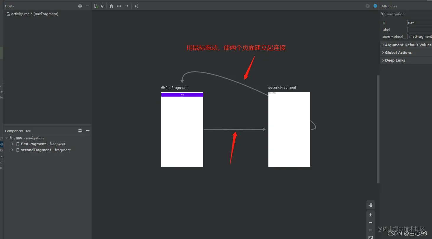 第三步:打开刚才建好的的nav.xml,加入前面建好的两个fragment,并建立连接