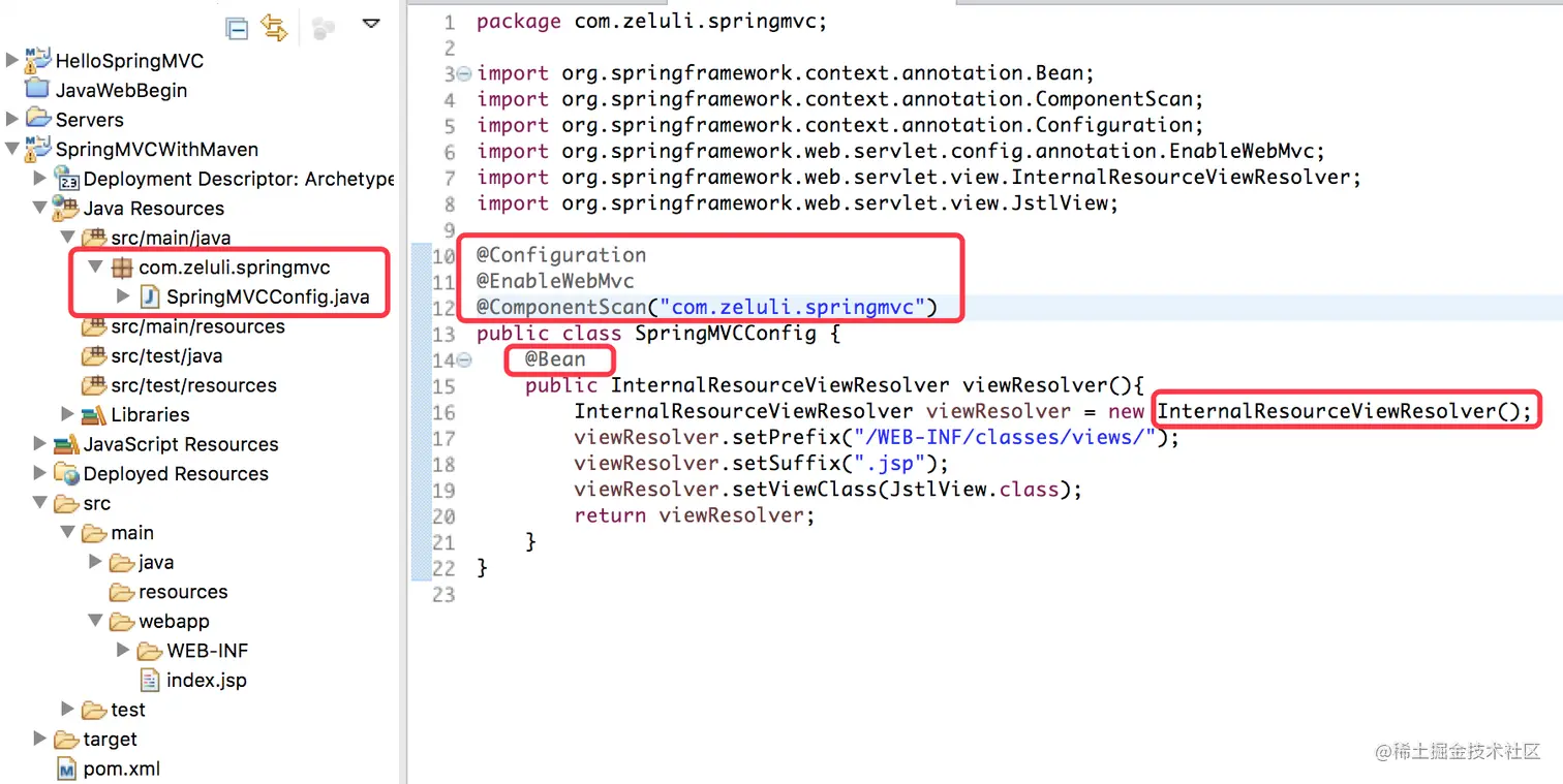 首先在src/main/java目录中创建一个包,用来存放SpringMVC相关的东西。然后在包中创建一个Java类,我们将该类命名为SpringMVCConfig。然后使用Spring的 @Configuration注解将其声明为配置类,然后使用 @EnableWebMvc开启WebMvc。然后在Java配置文件中配置InternalResourceViewResolver类的Bean。此处简单的说就是我们配置了一个JSP的View Resolver。如下所示。