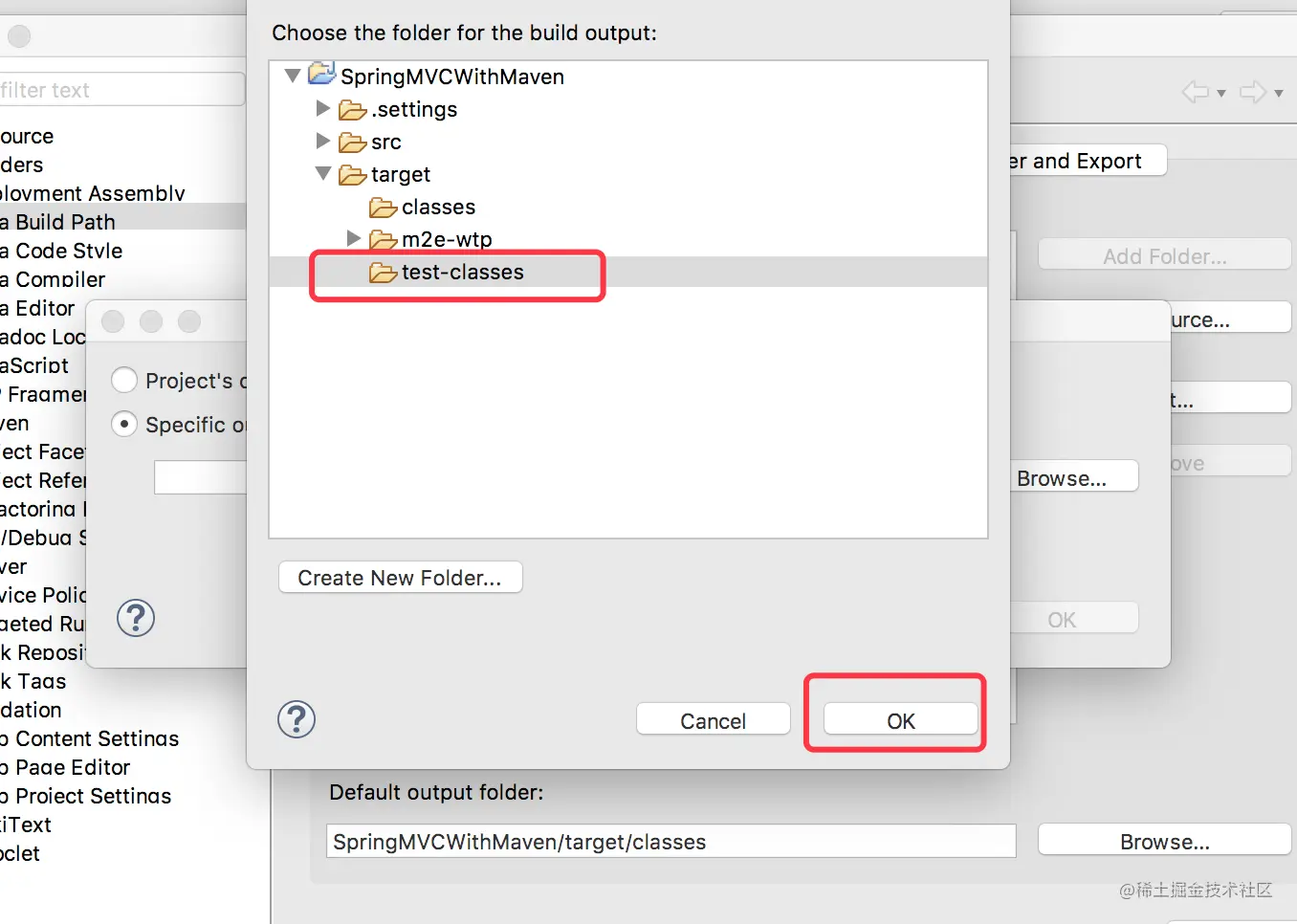 添加完该目录后,我们需要编辑一下上面创建的目录的Output folder。我们可以先看一下src/test/java目录的Output folder, 是taget/test-classes。 我们新添加的src/test/resouces也需要设置成target/test-classes。我们需要选中该条目然后进行编辑即可,如下所示。