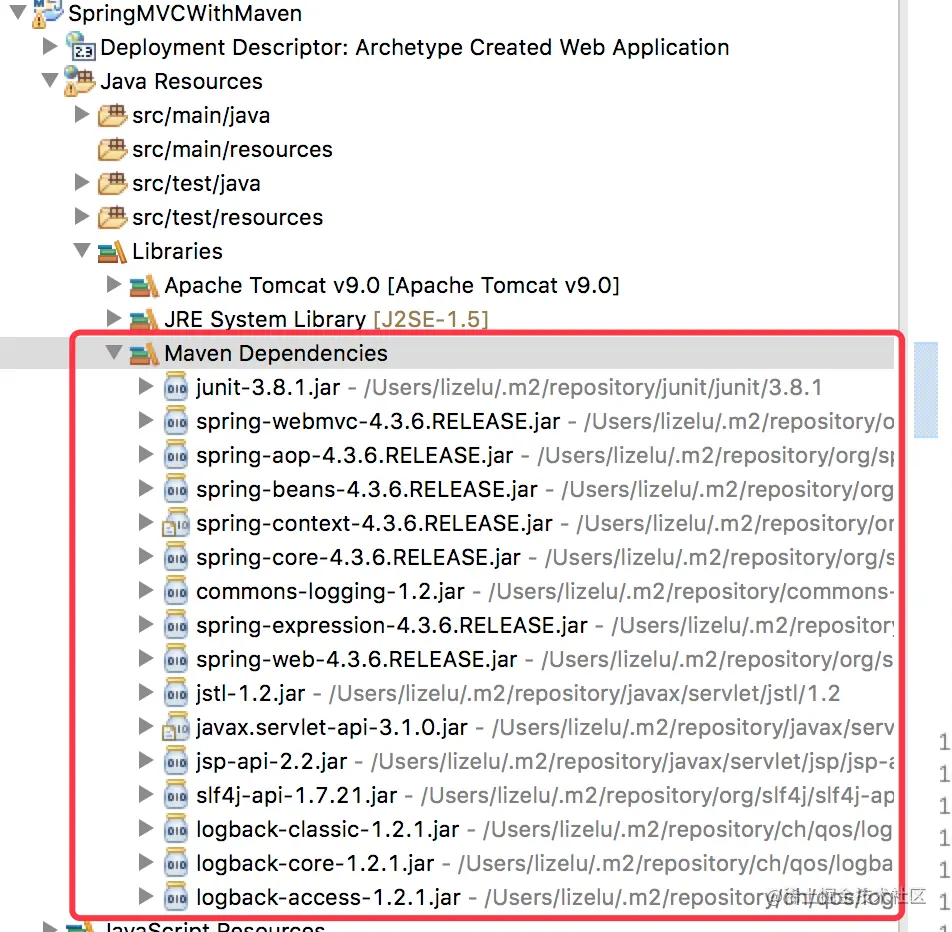 配置完毕后,我们会在目录中看到我们工程中所依赖的包,如下所示: