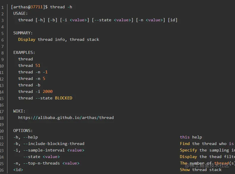 通过输入thread命令,可以查看当前线程的堆栈信息,支持管道。可以查看CPU使用前几名的线程,也可以查看指定CPU的线程堆栈。