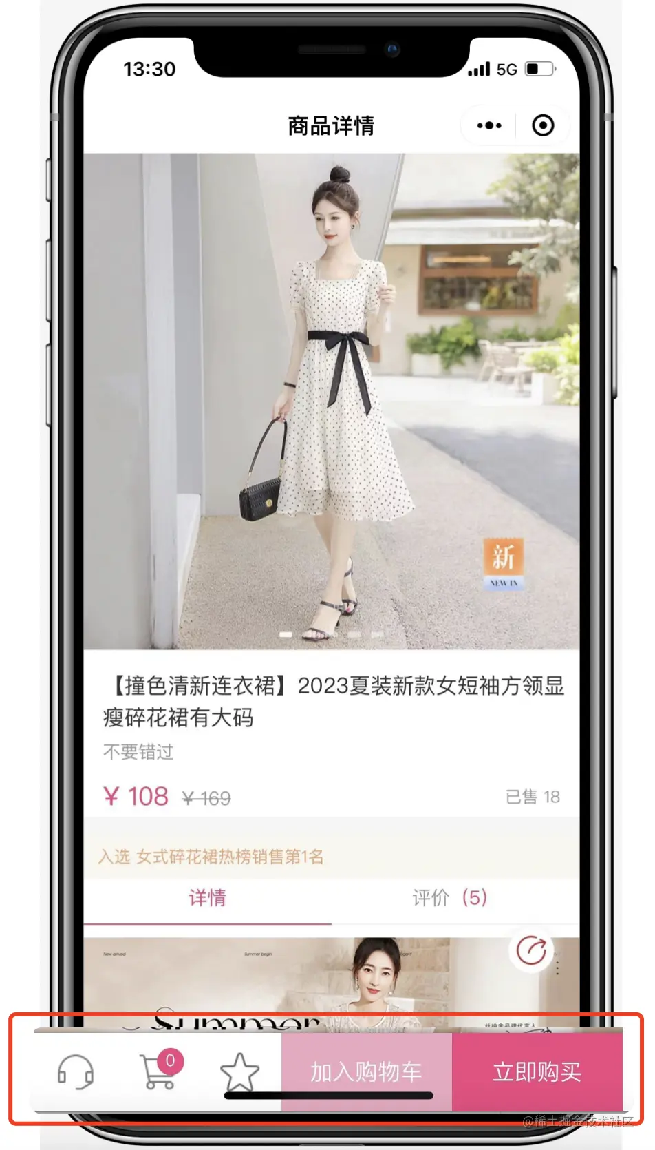 这两天正在开发商城小程序-商品详情页,在做设备测试的时候突然发现详情页底部—— 购物车 和 购买区域在苹果手机上不适配,并且还存在小黑条。 底部功能没有办法正常使用。 如下图所示:
