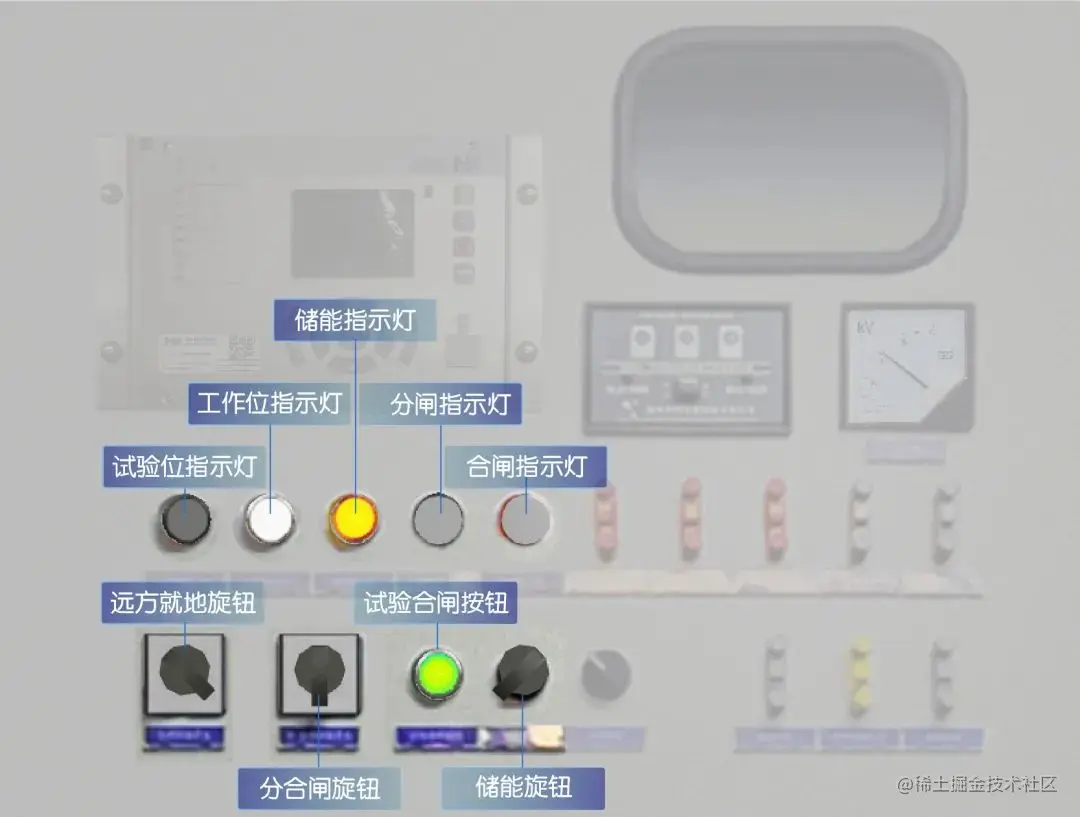 在 35kV 室开关柜中常见的开关包括断路器和刀闸,用于隔离电路、切换供电源和保护主母线及相关设备。通常使用远方/就地旋钮、分闸/合闸旋钮这两类控制装置控制开关柜的操作和状态。