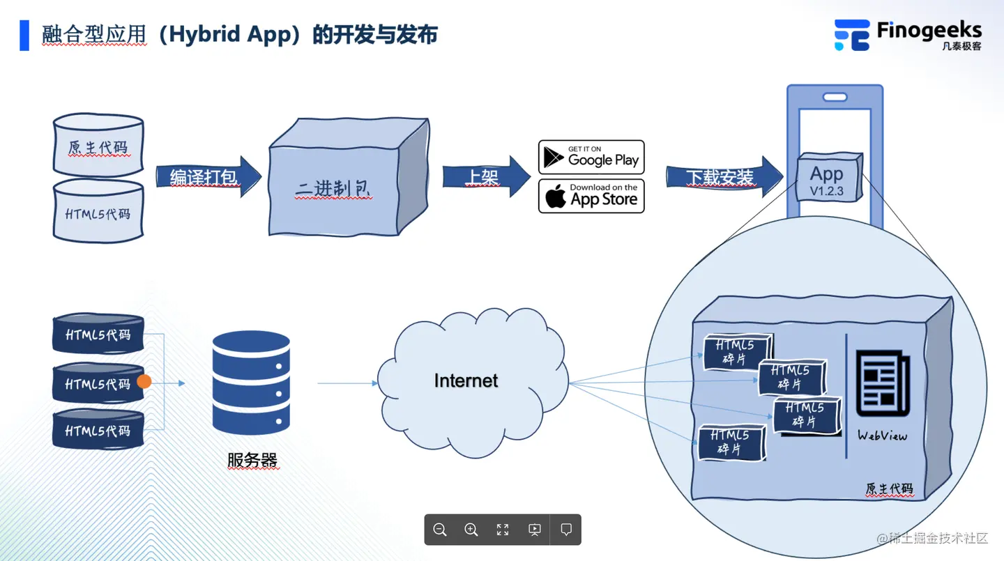 通常 APP 的服务器端要监测这些内容的更新,然后向设备端的 APP 以某种技术手段发送内容更新的通知,然后 APP 里的一些组件,需要向客户端通过网络同步一些页面内容碎片,并且把这些下载的内容,一般情况是 HTML 和 JavaScript,注入到之前挖好的这些洞洞里。