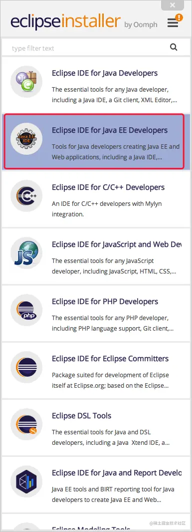 下方就是上述步骤安装的Eclipse Installer打开的结果。通过Eclipse的安装工具可以安装各种版本的IDE, 如下所示。因为我们要使用Eclipse来做Java EE的开发,所以我们选择Eclipse IDE for Java EE Developers即可。