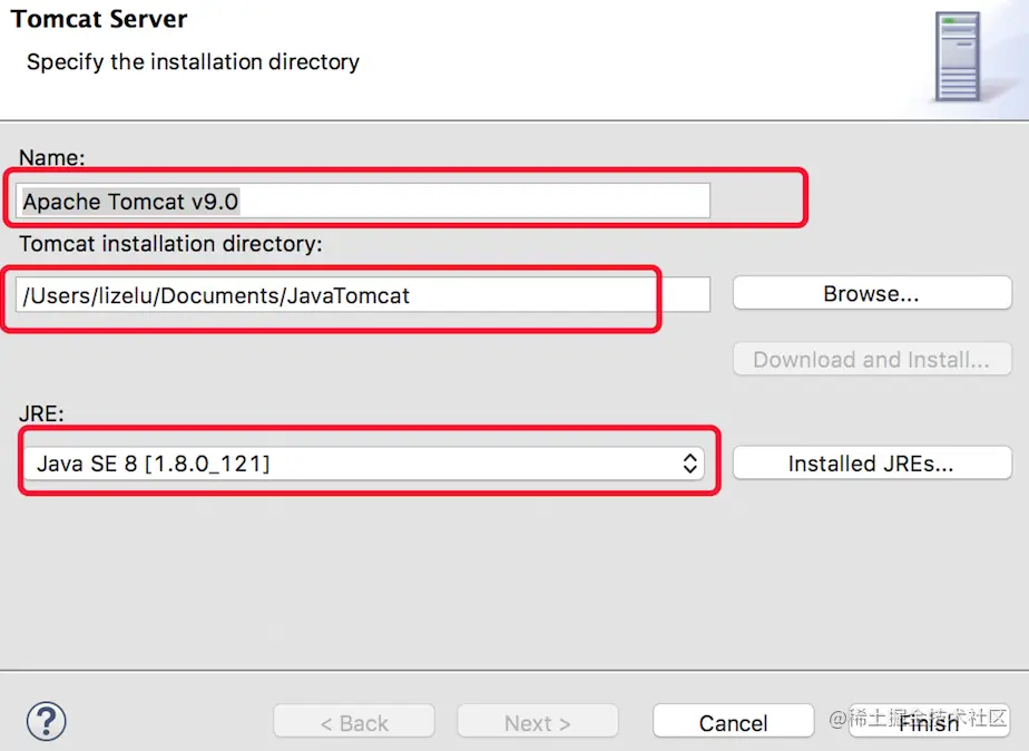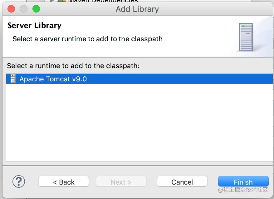 点击Next后选择我们之前配置的Apache Tomcat v9.0,然后点击Finish即可。添加完Libraries后不要忘记点击Apply按钮以及OK按钮。
