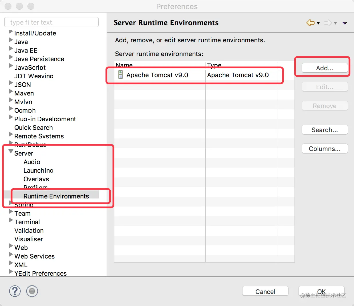 将上述下载好的Tomcat进行解压,接下来我们要在Eclipse配置我们的Tomcat9.0。打开Eclipse的偏好设置->Server->Runtime Environment->Add, 具体如下所示: