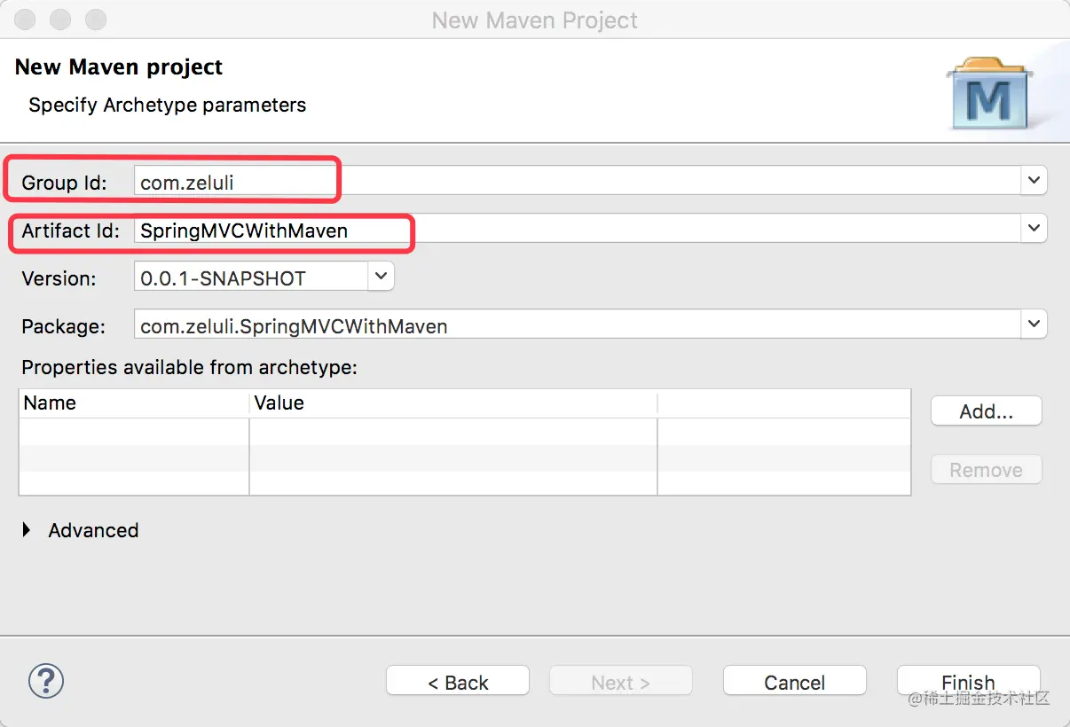 点击next后,接着我们需要输入组织名以及项目的名称,然后点击Finish即可。具体如下图所示: