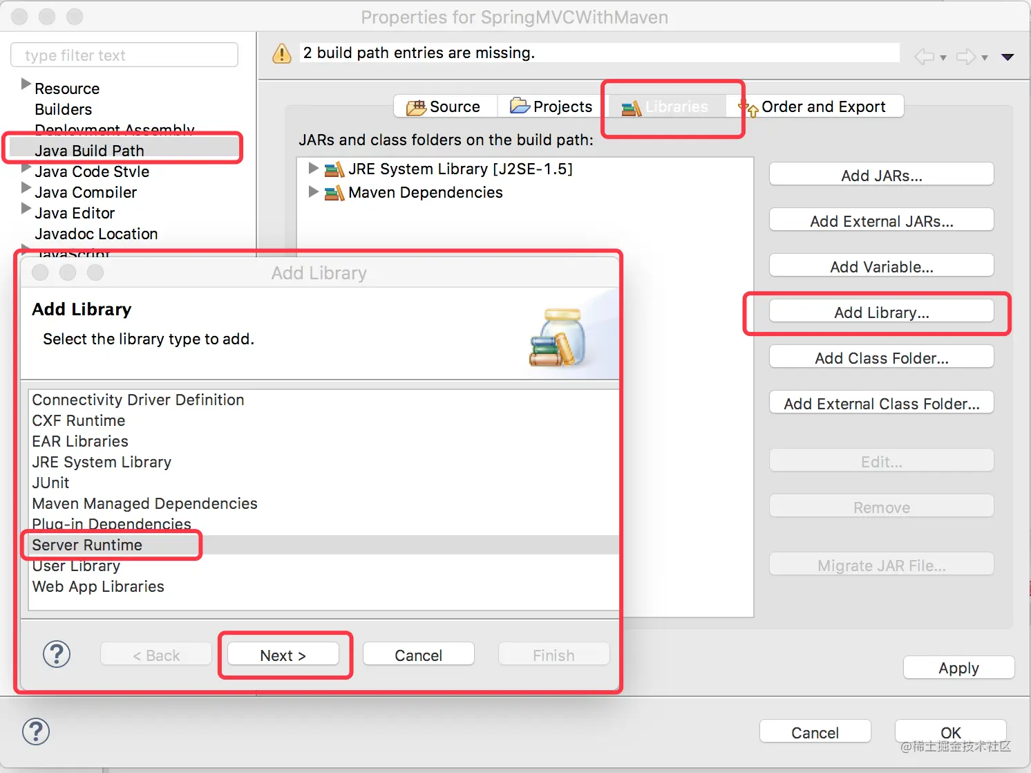 下方就是点击Properties后的对话框。然后我们找到Java Build Path -> Libraries ->Add Library… -> Server Runtime ->Next。 具体如下所示: