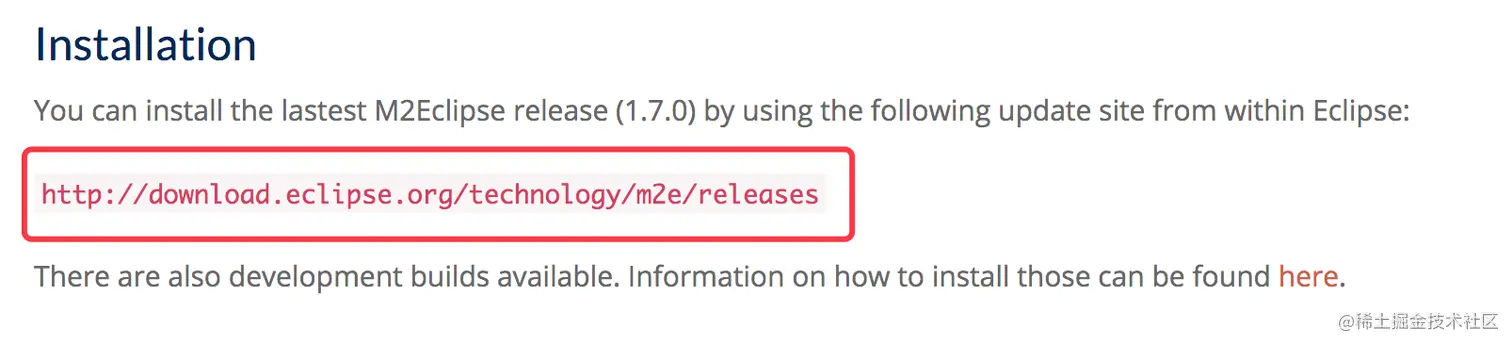 官网下方提供的这个地址就是M2Eclipse的在线安装地址,将改地址进行复制,备用即可。