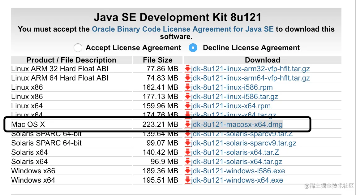 当然Java开发怎么少的了JDK了,我们可以从Oracle官网上下载相应平台相应版本的JDK(官网JDK下载地址请戳我)。打开链接后,找到下方这块区域,下载相应的JDK即可。当然我用的是Mac OS X的系统,所以下载的是下方File Size最大的那个。