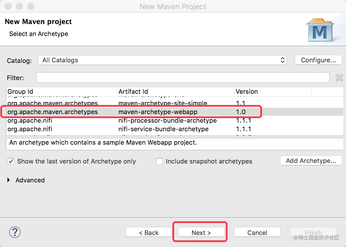 点击Next进入下述页面,下方的窗口是我们选择所创建的Maven Project的原型的。因为我们要创建Web项目,所以我们选择的是maven-archetype-webapp,然后点击next即可。