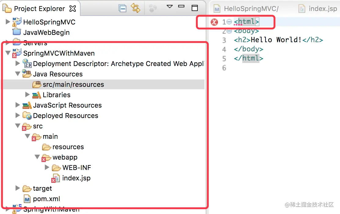 选择上述原型所创建的工程,默认是有错误的,如下所示。接下来我们要做的事情是将该错误解决掉。