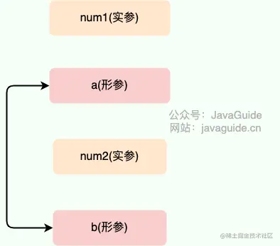 在 swap() 方法中,a、b 的值进行交换,并不会影响到 num1、num2。因为,a、b 的值,只是从 num1、num2 的复制过来的。也就是说,a、b 相当于 num1、num2 的副本,副本的内容无论怎么修改,都不会影响到原件本身。