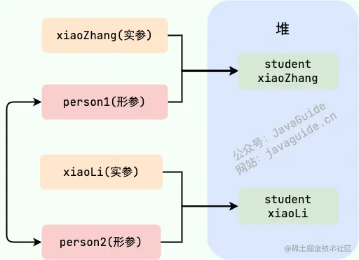 swap 方法的参数 person1 和 person2 只是拷贝的实参 xiaoZhang 和 xiaoLi 的地址。因此, person1 和 person2 的互换只是拷贝的两个地址的互换罢了,并不会影响到实参 xiaoZhang 和 xiaoLi 。