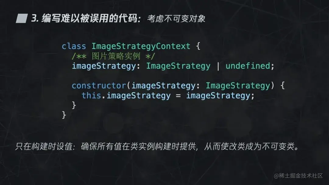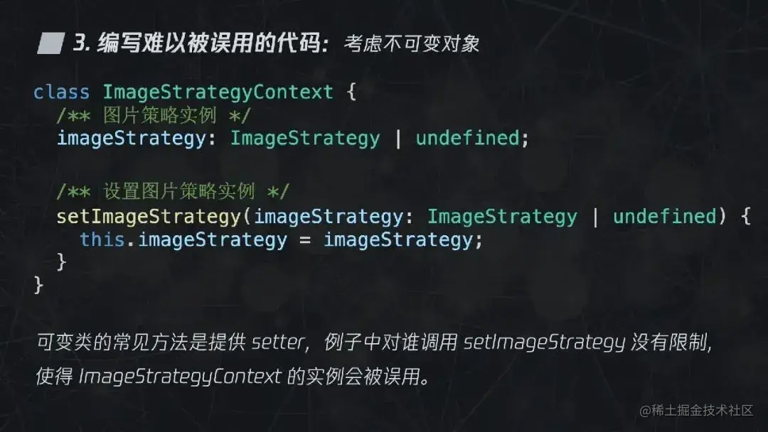 这段是前面例子中的策略上下文中的代码,这段代码实际上是不符合“编写难以被误用的代码”这条支柱的,因为它对谁调用 setImageStrategy 没有限制,从而使得 ImageStrategyContext 的实例会被误用。