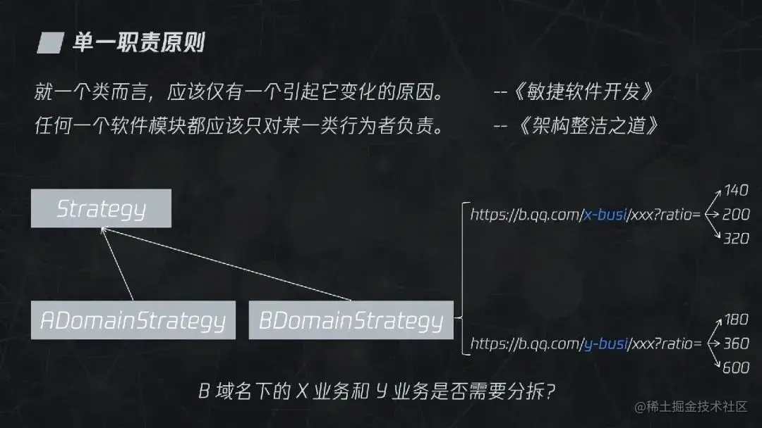 但一个域名一条计算规则时,我们很容易就能够辨别两者之间存在差异,因此需要拆分出两个类。但实际业务是复杂多变的,在 B 域名中又区分了不同业务,每个业务又存在差异,那么 B 域名下的 X 业务和 Y 业务是否还需要分拆?如果对单一职责理解不深,很有可能觉得不需要分拆,但我们现在知道单一职责需要考虑变化以及变化的来源,那么很自然地就能够知道需要进行分拆。