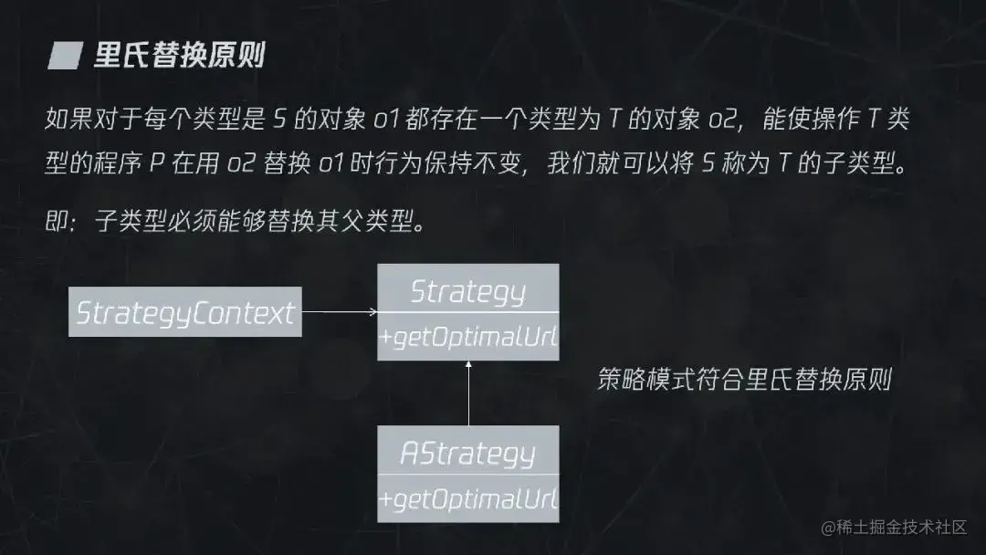 在图片优化工具的案例中,每个具体的策略都是可以自由替换其父类 Strategy 的,因此符合里氏替换原则。