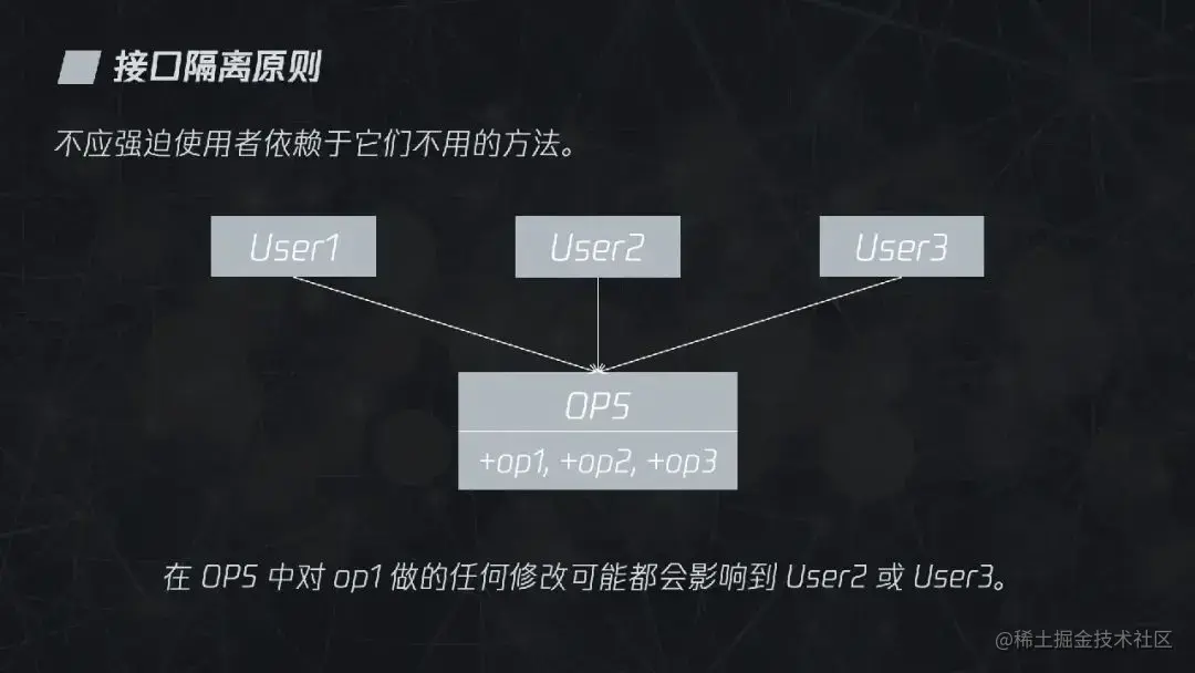 接口隔离原则指的是“不应强迫使用者依赖于它们不用的方法”。这个表述看上去很容易理解,尤其是站在使用者的角度,我不需要的接口当然不需要依赖。但作为模块的设计者,都会有将接口设计得过胖的冲动。在下图中,OPS 类提供了 op1、op2、op3 方法分别供 User1、User2、User3 使用,在 OPS 中对 op1 做的任何修改可能都会影响到 User2 或 User3。
