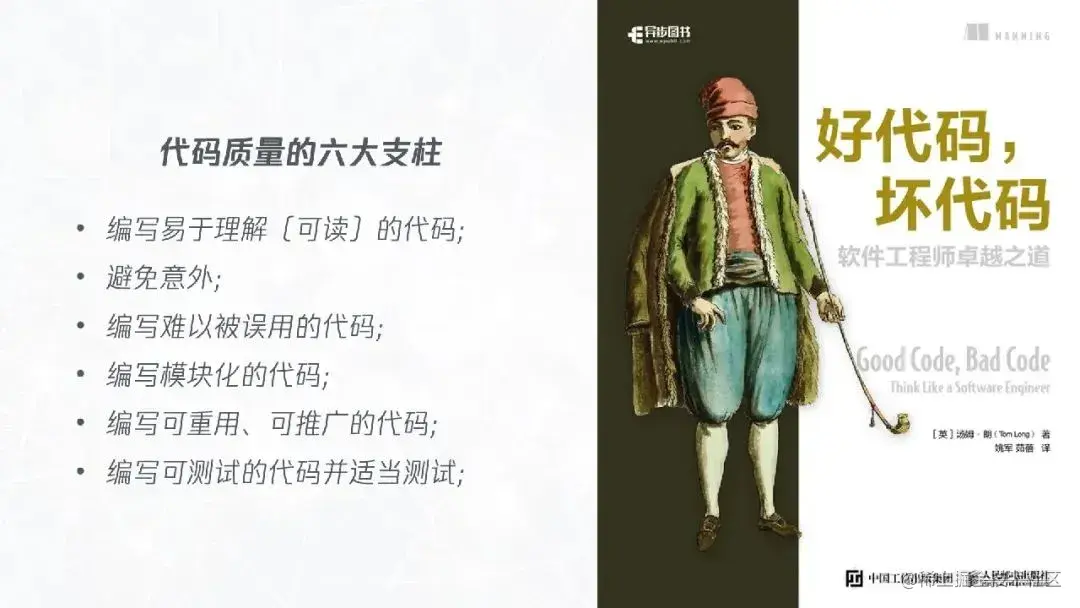 虽然我们知道了高质量代码的目标,但仅仅知道目标也没有办法下手,我们还需要更加具体的策略。为什么很多人讨厌鸡汤,就是因为那些人只给了鸡汤而不给勺子,我们这里既给目标也给具体的策略。这就是代码质量的六大支柱。接下来我会结合前面所讲的例子分别介绍这六大代码质量的支柱。需要注意的是,每个支柱代表了一种原则,而实现这个原则可以有很多具体的措施。