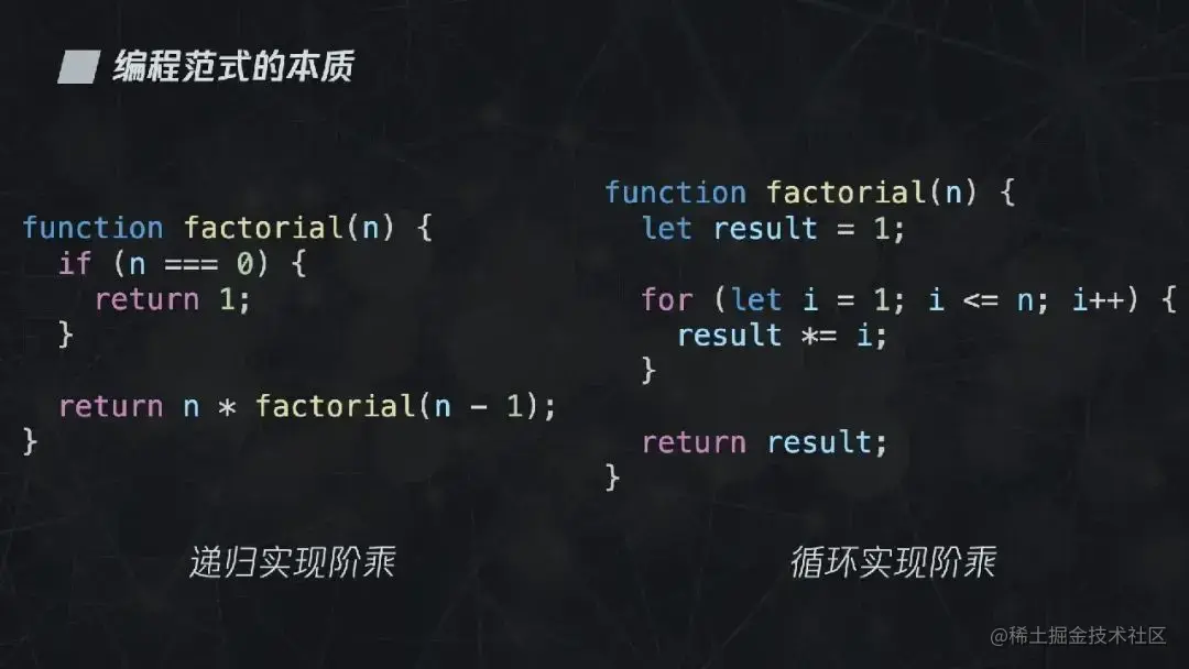 拿一段计算阶乘的代码来具体解释一下。所谓阶乘,就是小于等于某个整数的所有正整数的乘积,我们可以用递归也可以用循环来实现,无论是哪种算法都能够得到相同的结果。因此可以说,递归或者循环是 Control,而阶乘的计算规则是 Logic。