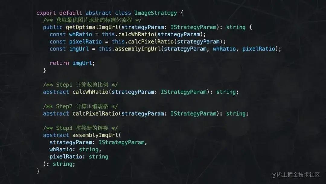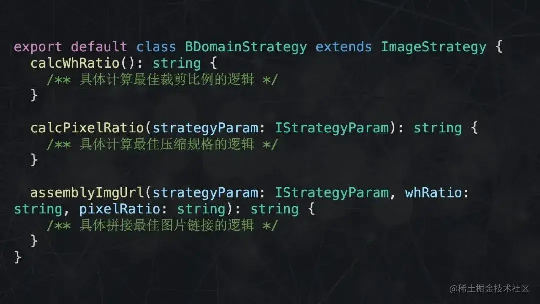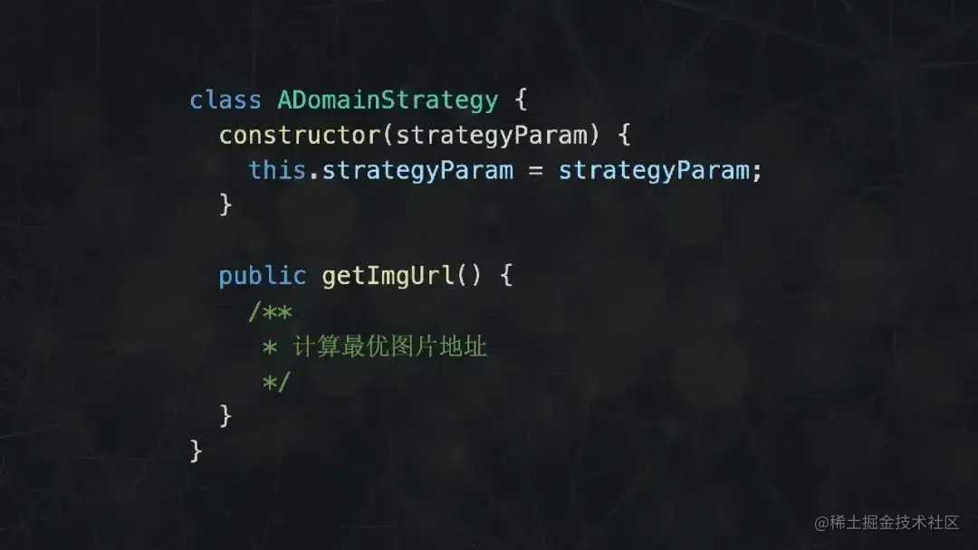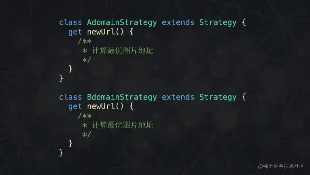 首先声明一个 Strategy 基类,在构造函数中传入必要的参数,提供一个 getter 函数,用于计算最佳图片链接。每当有新的域名需要处理,就声明一个类继承 Strategy 基类。就这样,利用了多态的代码在逻辑上显得更为清晰。