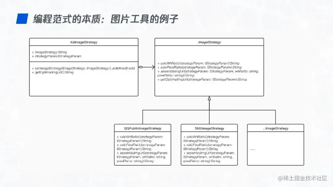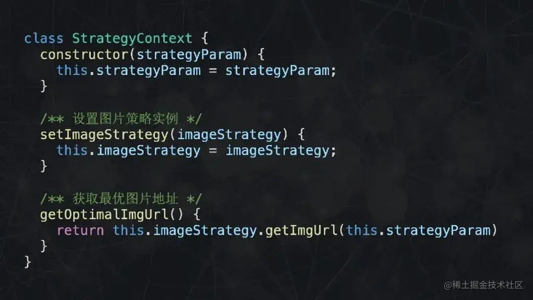 每个具体的策略类通过构造函数传入所需的参数,提供一个名为 getImgUrl 的公共方法。而在策略上下文类中,设置具体的策略以及提供获取最优图片地址的方法。