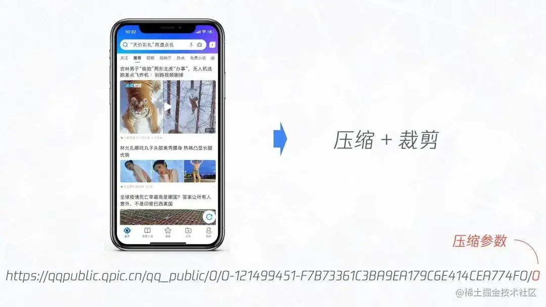 故事还得从一个性能优化的经历说起,信息流业务中经常需要展示图片,如果图片的体积过大则会导致性能问题,体积过小用户看得模糊体验又不好,因此需要一个适中的图片体积。得益于腾讯强大的基建,业务方不需要自己对图片进行处理,而只需要修改图片链接的参数即可调整图片的裁剪和压缩尺寸。