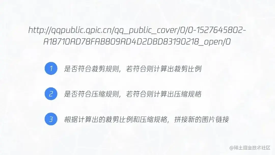 | 判断原图链接是否符合裁剪规则,如果符合就计算出最优裁剪比例。不能随便给个 qq.com 就直接去裁剪了,要对链接进行校验; 判断原图链接是否符合压缩规则,如果符合就计算出最优压缩规则。道理与上面类似,有的图片不支持压缩,因此也需要判断; 拼接新图链接。 |