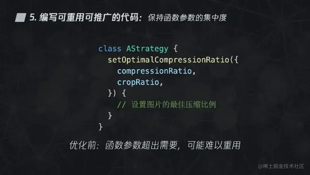 在下面这段代码的计算最佳压缩比例方法 setOptimalCompressionRatio 中,传入了 compressionRatio 和 cropRatio 两个参数,但实际上只需要传入 compressionRatio 即可。这种函数参数超出需要的情况,可能会使得代码难以重用。我们可以删除 cropRatio 这个参数,让函数只取得其所必要的参数。