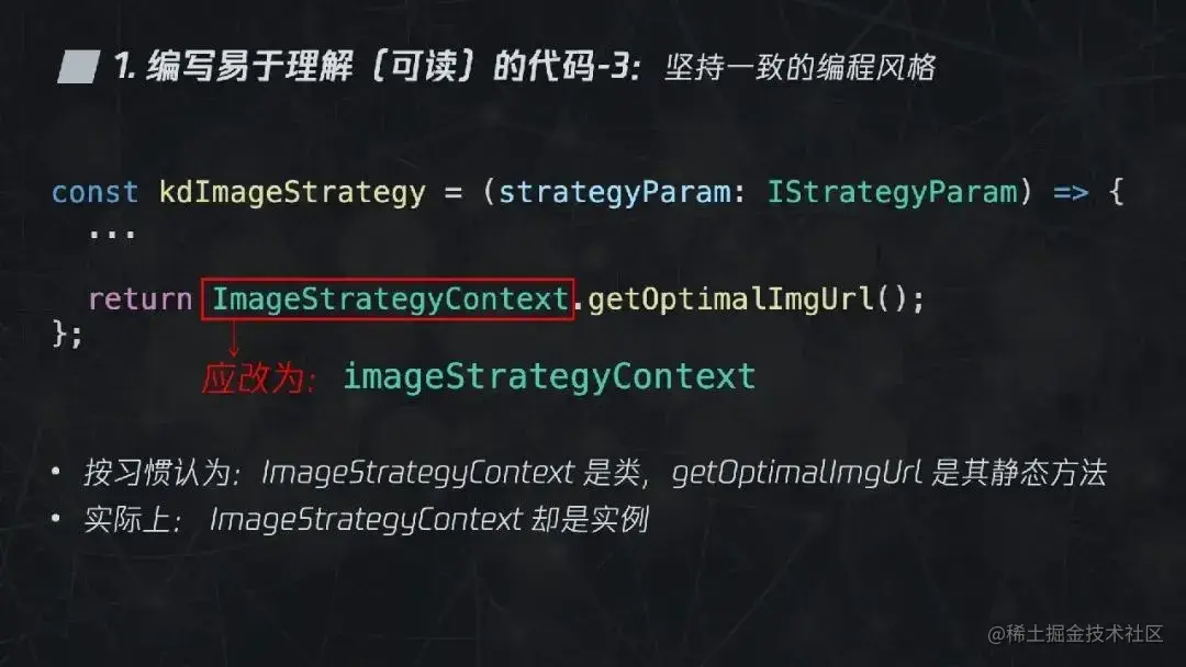 按照我们的习惯,可能会认为 ImageStrategyContext 是类,getOptimalImgUrl 是其静态方法。出现这样的误会的原因就是写错了变量的命名风格。