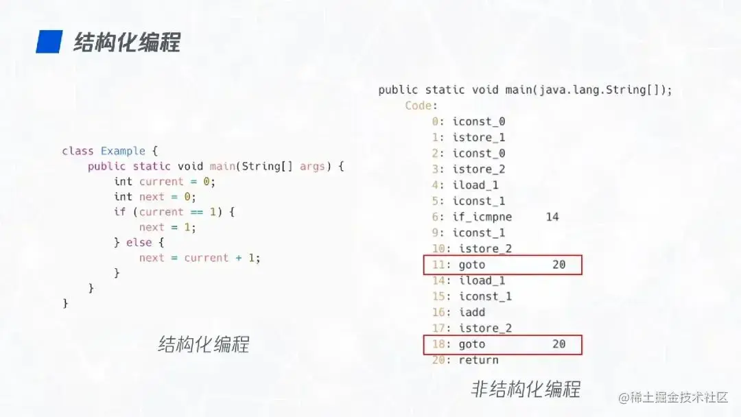 想要了解结构化编程,一定得回到那个古老的年代,看看非结构化编程是怎么样的。下图中左边是一段用 Java 写的代码,这是一段包了面向对象的结构化代码,屏幕的右边是对左边代码反编译后的字节码,代码从第 0 行开始执行,但执行到第 6 行时,会进行判断,如果结果是真就跳到第 14 行,11 行也是类似。大家可以看到非结构化编程的主要特点之一就是通过 Goto 进行执行逻辑的跳转。