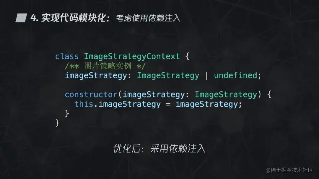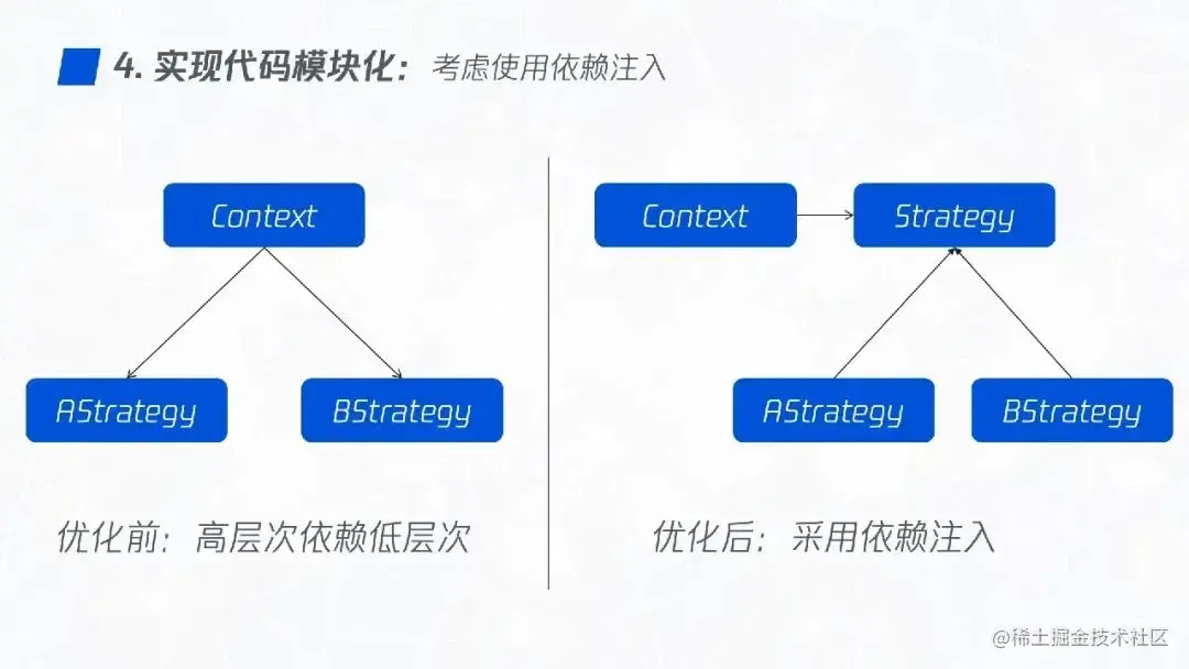 我们可以采用依赖注入的方式,通过构造函数传递将策略实例进来,这样可以更好地实现代码模块化。