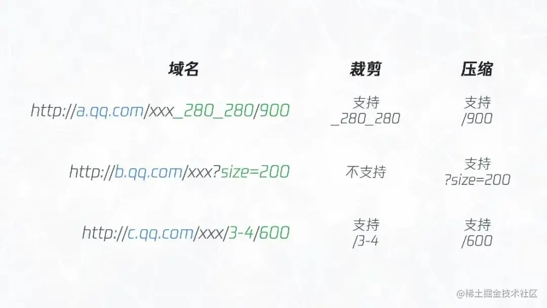 这还没完,突然产品经理说:“再支持两个新域名”。由于一些历史原因,司内存在不少相似的服务,但能力都大同小异,都是通过改变链接中的参数来修改图片的裁剪和压缩尺寸。比如下图所示,有的域名同时支持裁剪和压缩,但需要直接修改路径;有的域名不支持裁剪,参数也是通过 query 形式传入。因此我们需要针对不同域名进行不同判断。