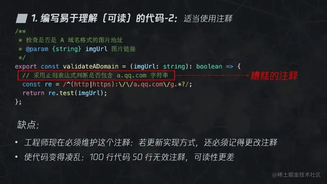 注释往往可以帮助我们更好地理解代码,但是不是所有注释都是好的呢?我们可以看下面这段代码的注释,里面包含两段注释,一个是描述方法的用途,另一个是描述具体的实现。第二个注释就是个糟糕的注释,因为工程师在代码维护时不得不维护这个注释,如若更新了实现方式,则需要记得更改注释。同时,如果 100 行代码中有 50 行像这样的无效注释,那么反而增加阅读代码的难度。
