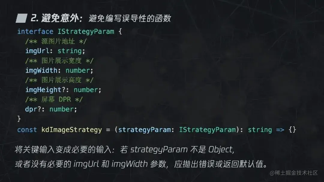 “避免编写误导性的函数”是一种避免意外的方式。比如下图中的代码,使用 kdImageStrategy 的代码契约就是传入的参数必须要是对象,并且对象中要包含 imgUrl 和 imgWidth 这两个参数。但遇到不符合要求的参数情况,应该主动抛出错误。