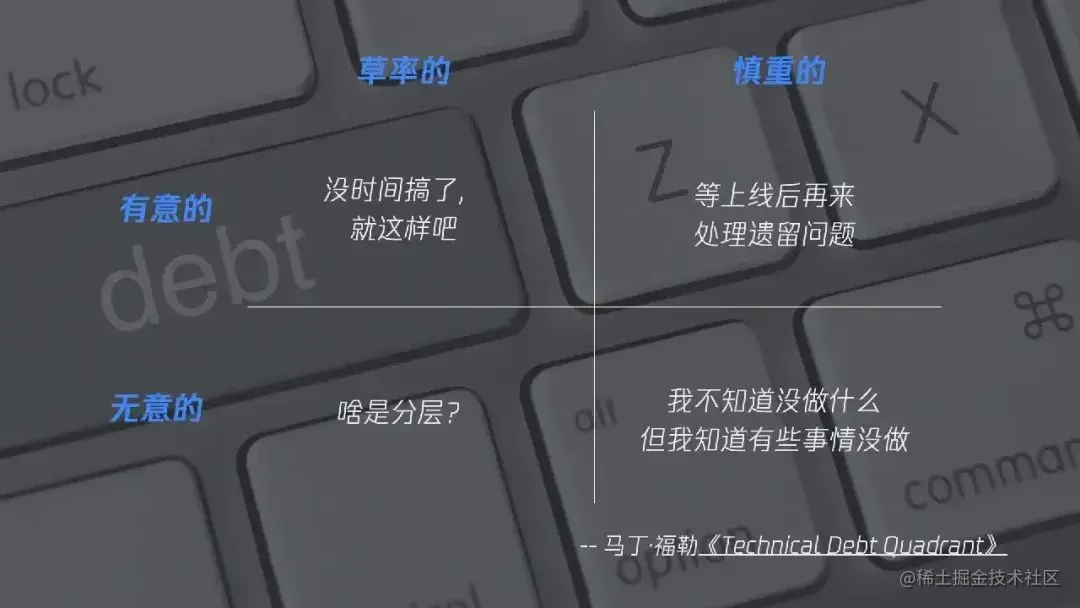 《重构》的作者马丁·福勒按照有意无意和草率慎重两个维度将技术债分为了四个象限,简称“技术债象限(Technical Debt Quadrant)”。慎重的债务都是经过深思熟虑的,他们知道自己欠下了债务,但在项目早日上线和还清债务之间做了评估后,发现前者的收益远远大于后者的成本,因此选择先上线,这种技术债便是慎重有意的。草率的债务可能不是无意的,也有可能有意为之,项目团队知道良好的设计也有能力进行实践,但却认为无法承担得起清偿技术债所需的时间成本。但其实对于大多数没有学习过软件工程或者进行过优秀实践的开发人员来说,大多欠下的是草率无意的技术债。最后是慎重无意的,我们在进行项目开发时,常常一边开发一边学习,你可能需要花一年甚至更长时间才能明白这个系统的最佳实践。
