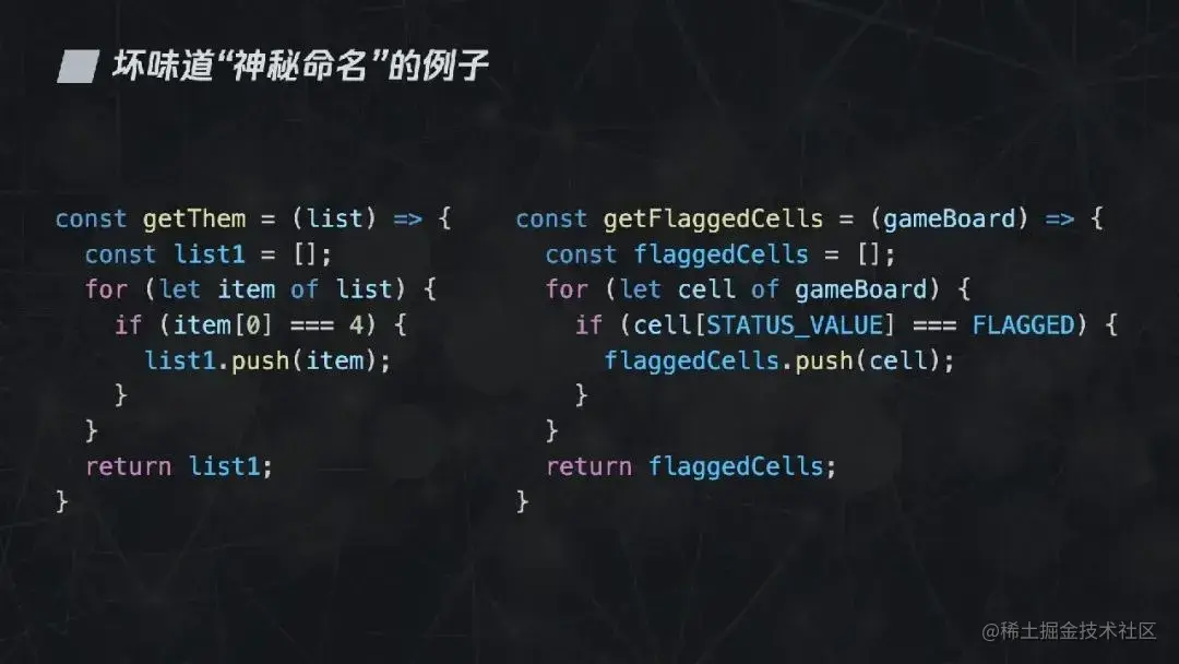 如果仅仅把命名改一下,getThem 换成 getFlaggedCells,获取标记的单元格,list 改成 gameBoard,哦原来是个棋盘呀,下面就不用读了,你已然清楚这段代码是用来读取棋盘中已经被标记的棋盘格了。