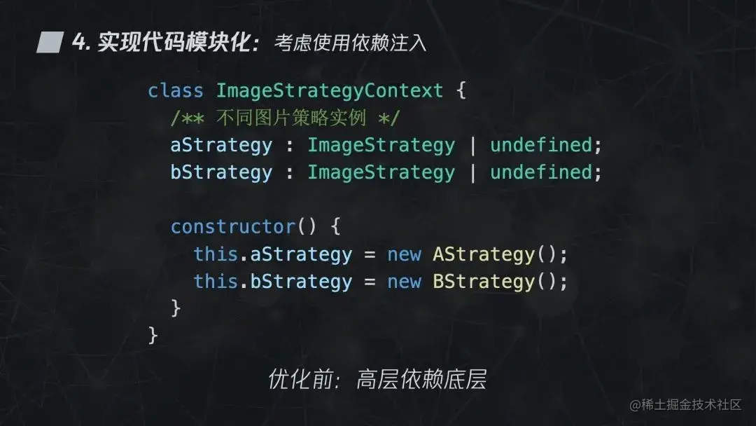 下面的代码中,ImageStrategyContext 对它的子解决方案是硬编码依赖的,直接在内部声明了两个策略的实例。