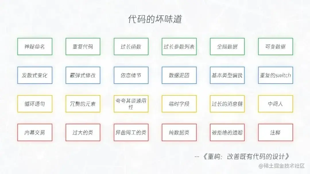对此,马丁·福勒在《重构》一书中枚举了 24 种代码异味,这样我们识别代码异味便有了抓手,也就可以识别技术债。