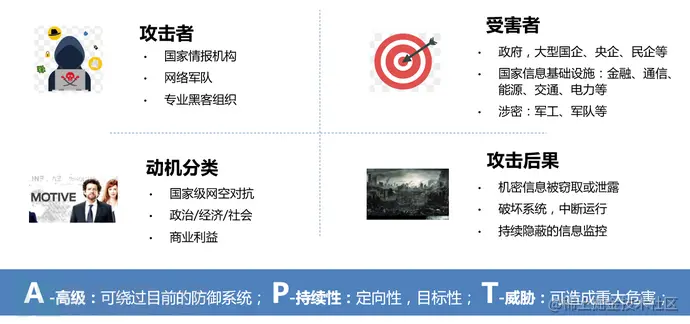 APT即高级可持续威胁攻击,也称为定向威胁攻击,指某组织对特定对象展开的持续有效的攻击活动。这种攻击活动具有极强的隐蔽性和针对性,通常会运用受感染的各种介质、供应链和社会工程学等多种手段实施先进、持久且有效的威胁和攻击。